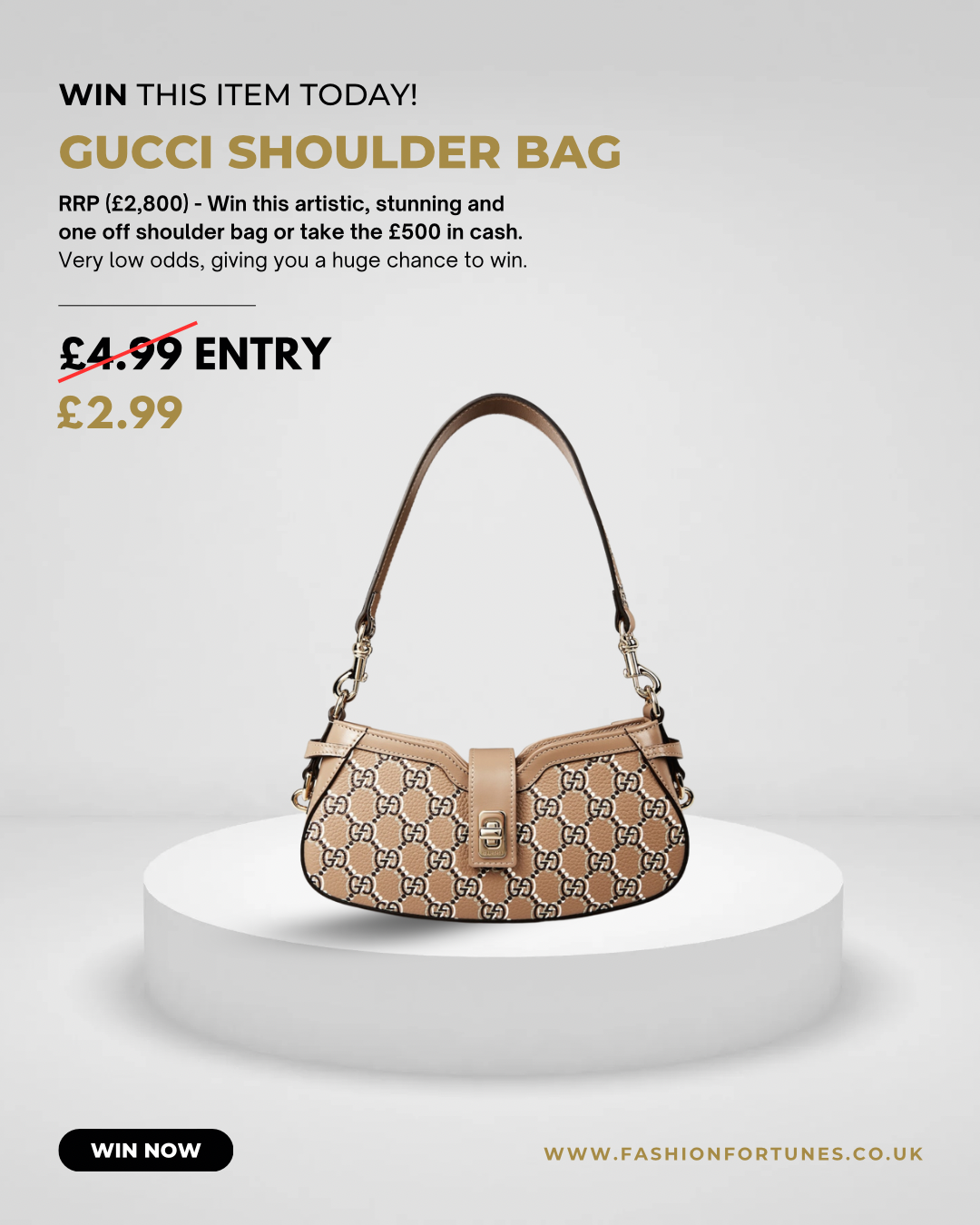 Bag yourself a luxury win with this stunning Gucci Shoulder Bag (RRP £2,800), yours for just a small entry fee in our latest raffle. Crafted with iconic Gucci styling and premium materials, it’s the perfect mix of elegance and everyday wear. Prefer the money? Choose £500 cash alternative instead.